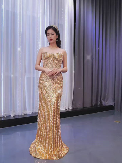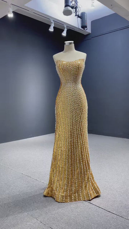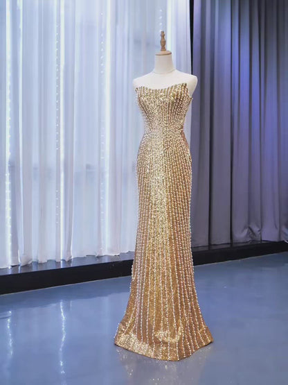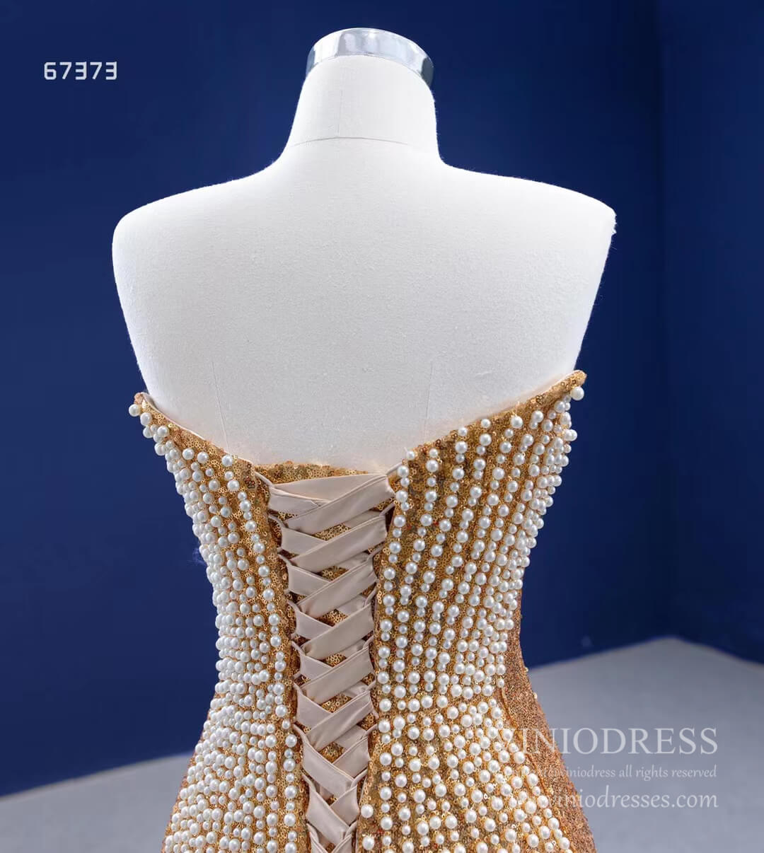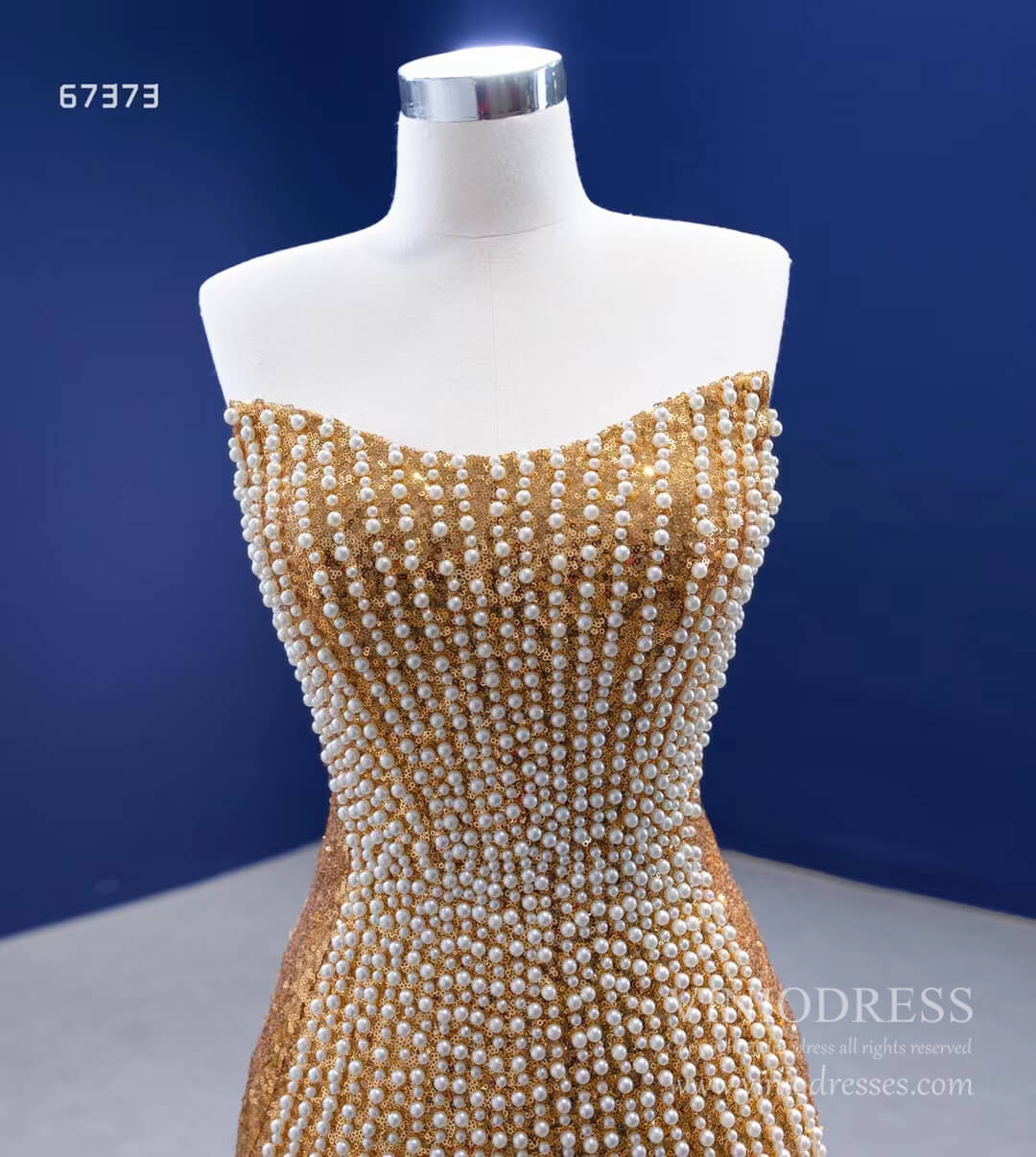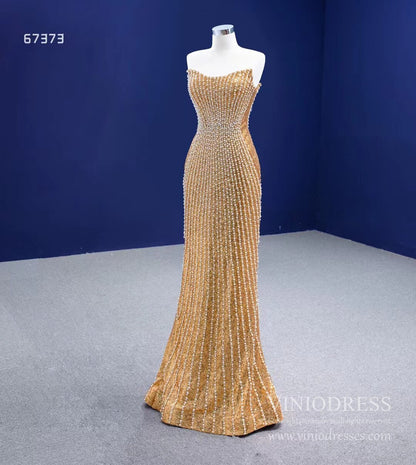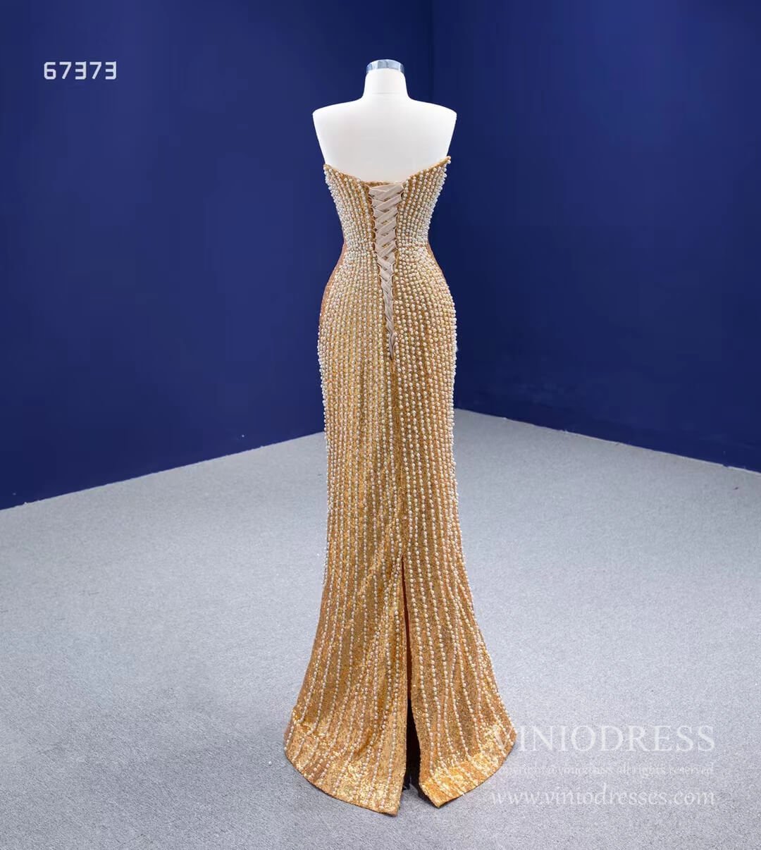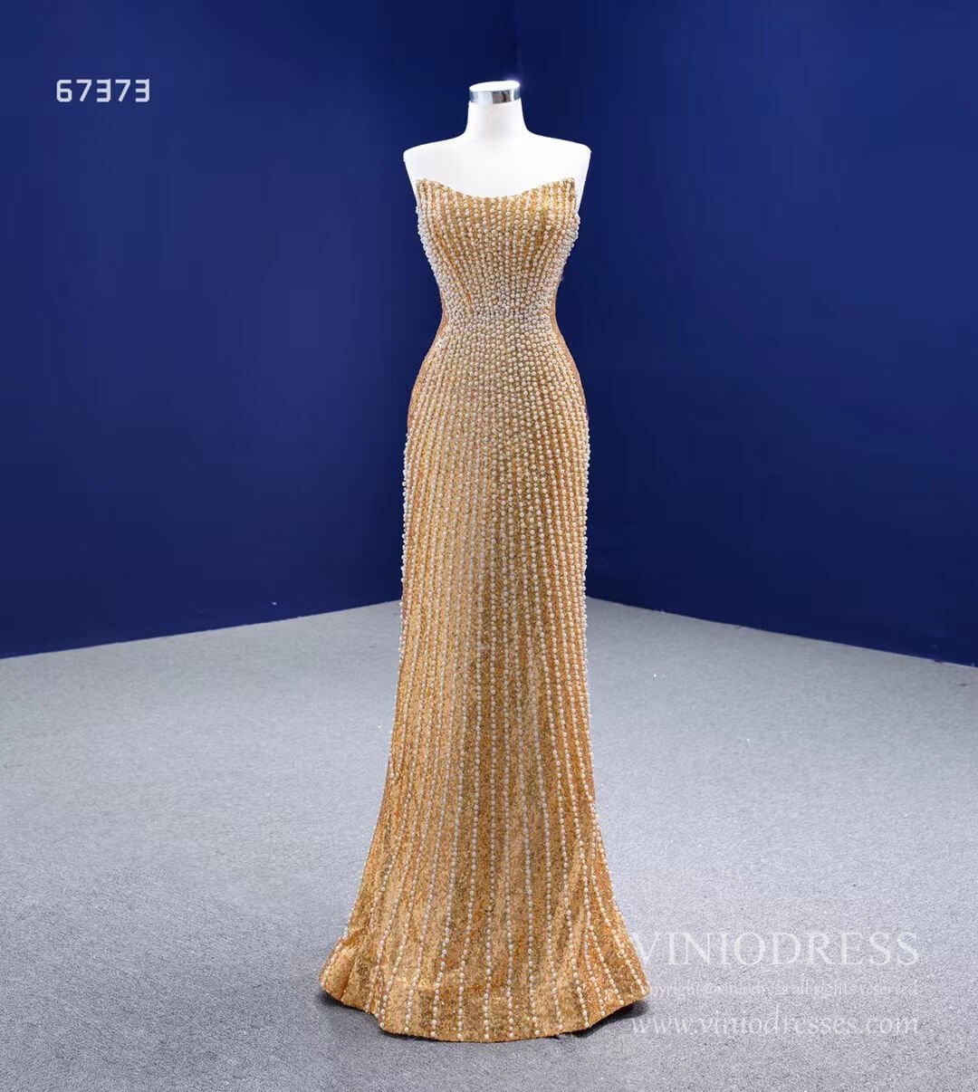 Strapless Gold Sheath Pearl Prom Dresses VINIODRESS 67373 viniodress