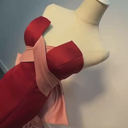 Make a dazzling entrance at your special occasion in this dress. Adorned with luxuriant orange satin fabric and gracefully designed with a mermaid silhouette and elaborate bow-tie train, this dress exudes elegance and charm. Prepare to turn heads!