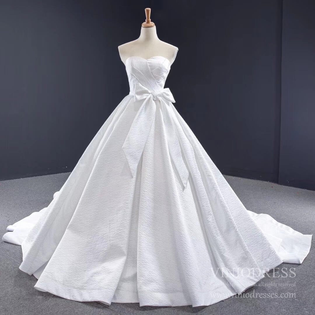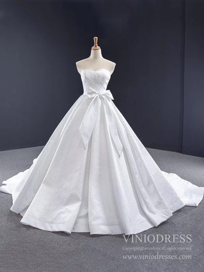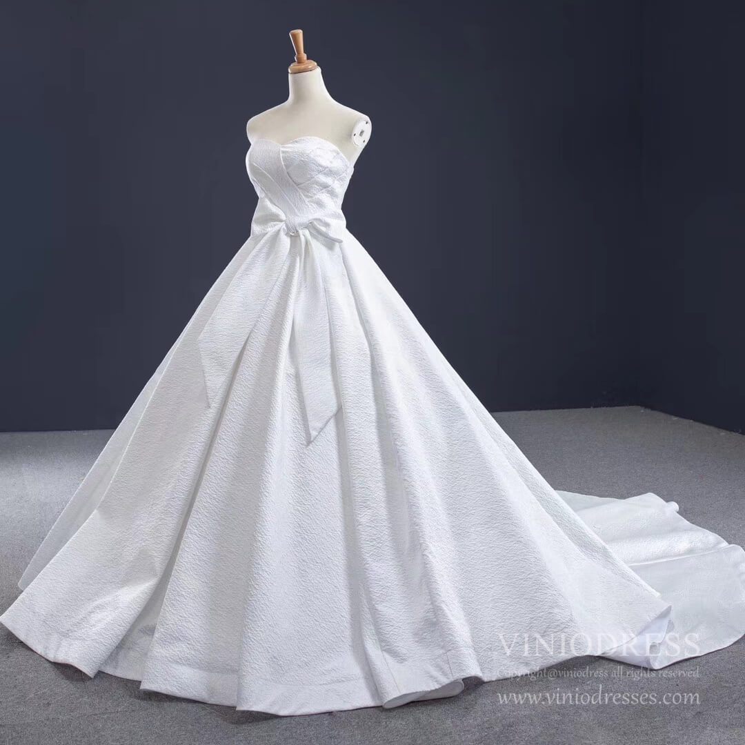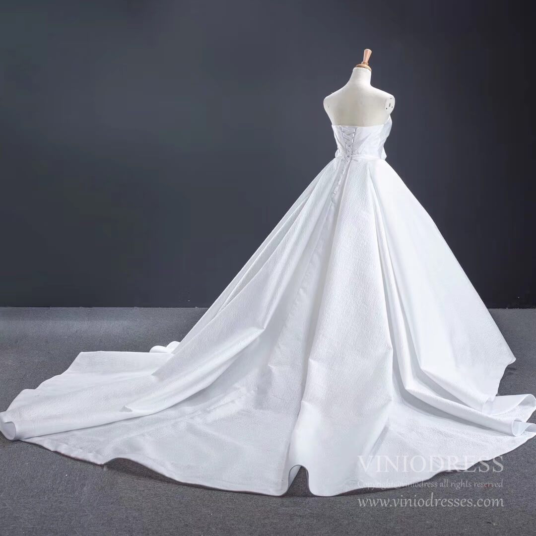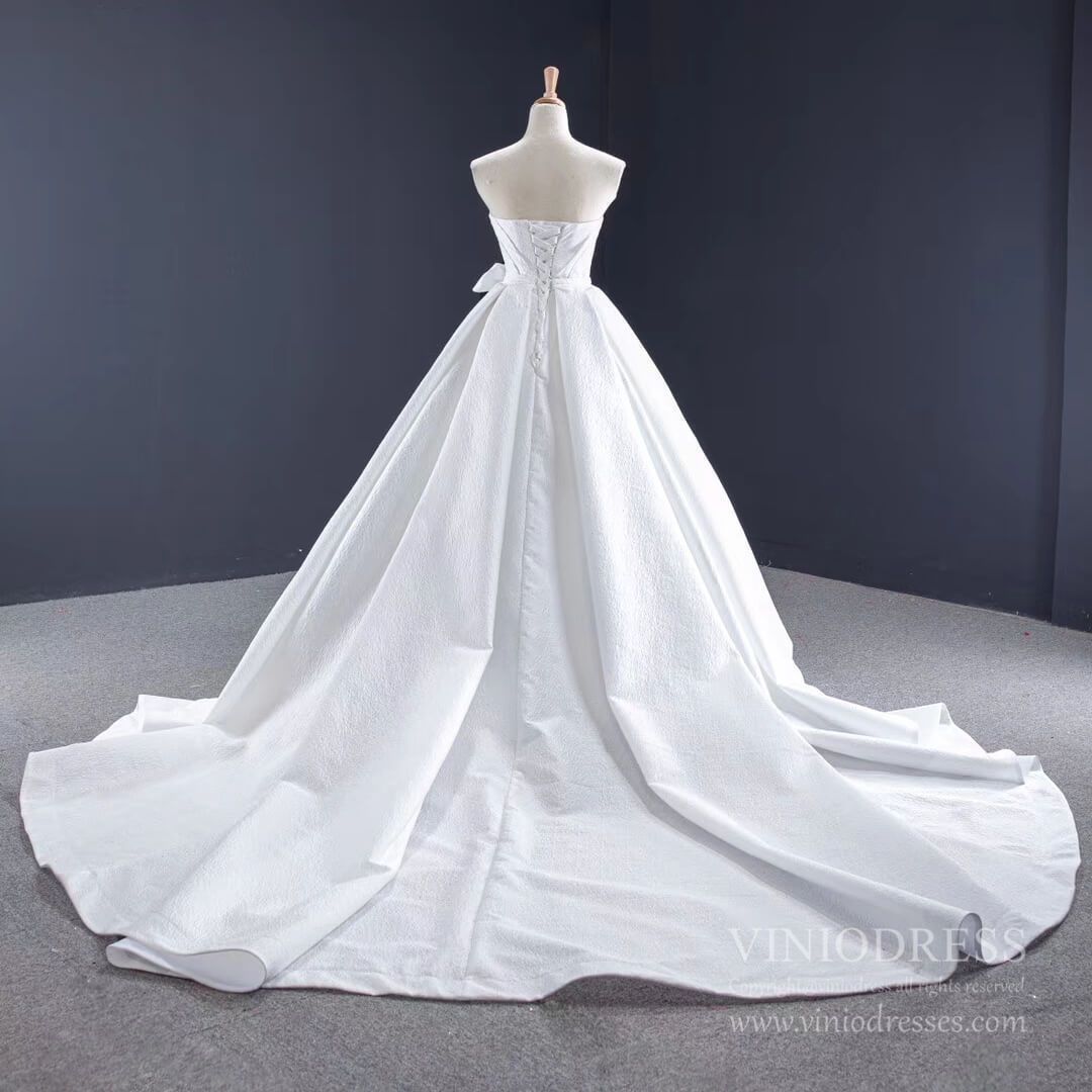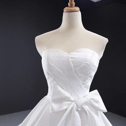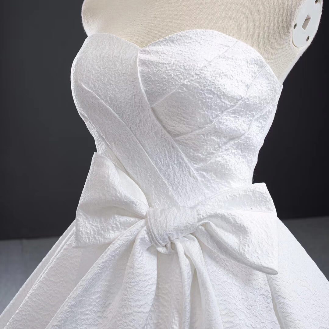 Delicate ice-blue floral appliques trace the neckline and trail gracefully along the hem of the 1-meter long train, adding dimension and luxury. A dramatic bowtie detail at the back completes the gown with a charming, regal touch.