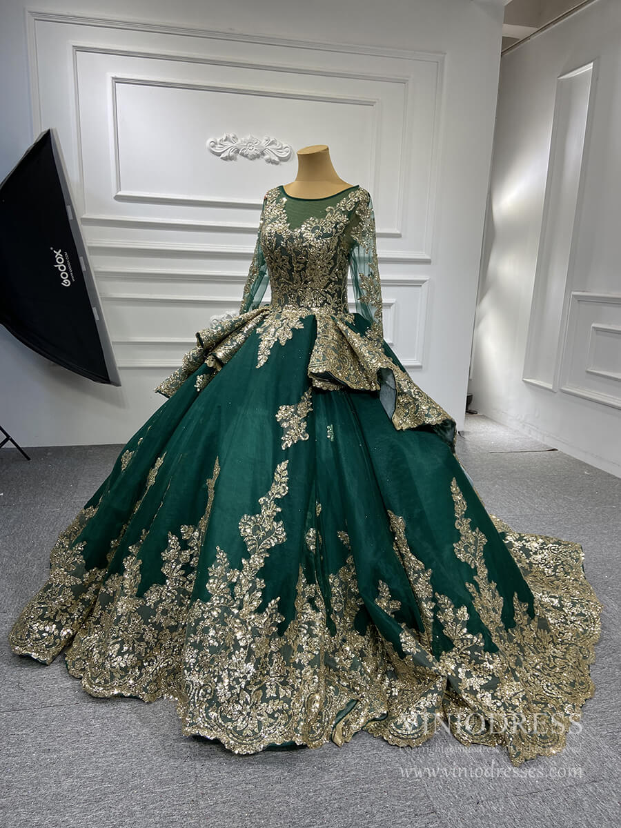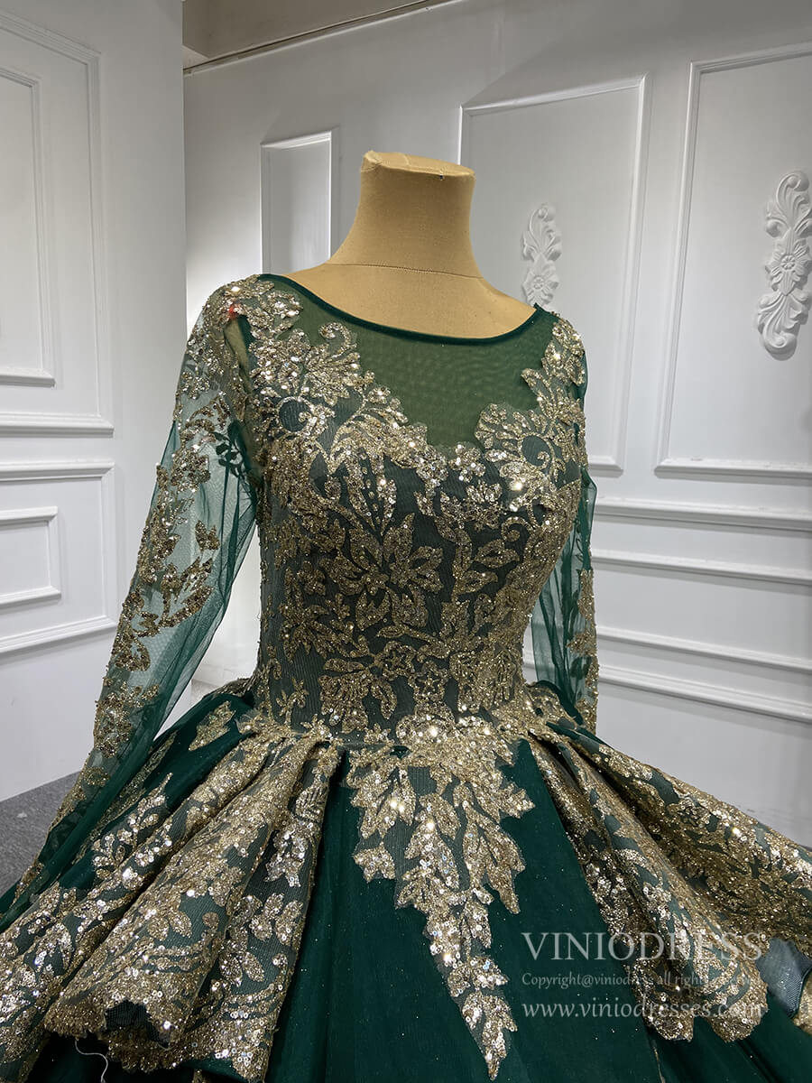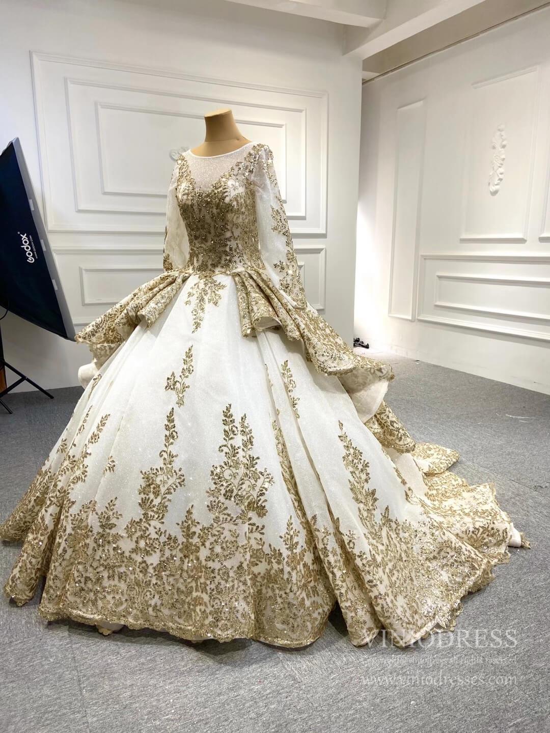 Elegant, refined, and timeless, this modest long sleeve gold lace ball gown wedding dress brings together luxurious detailing and full-coverage sophistication. The gown features shimmering sparkly gold lace appliqués over tulle, creating a luminous finish that catches the light beautifully. Designed with a voluminous gold lace ball gown silhouette, it flows into a graceful 12 inches long sweep train wedding dress for a soft, regal presence.