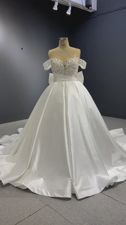Elegant off the shoulder satin wedding dress.