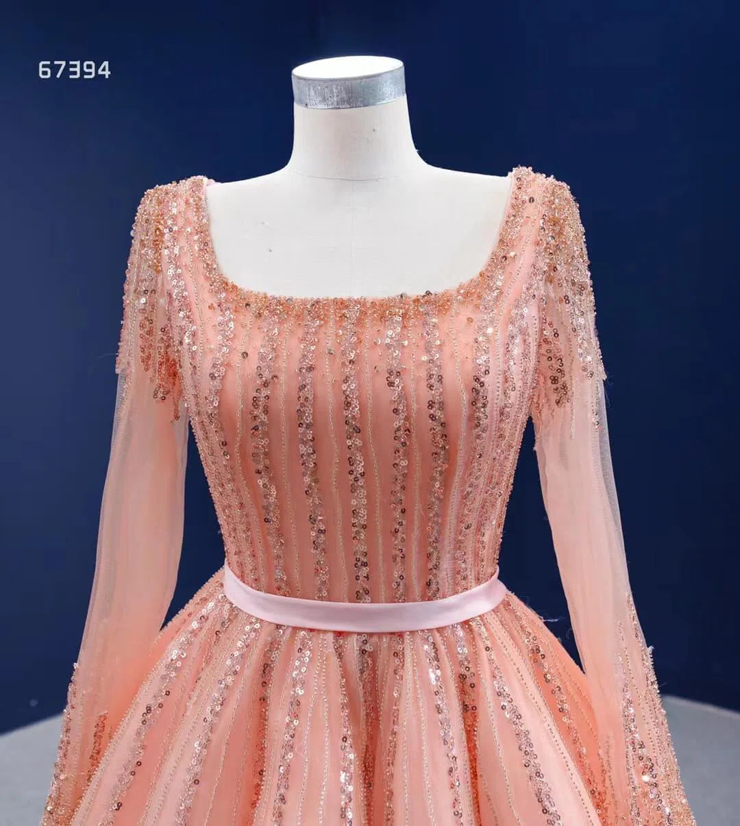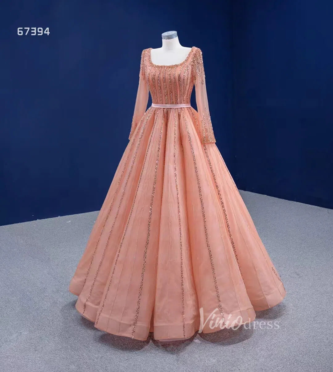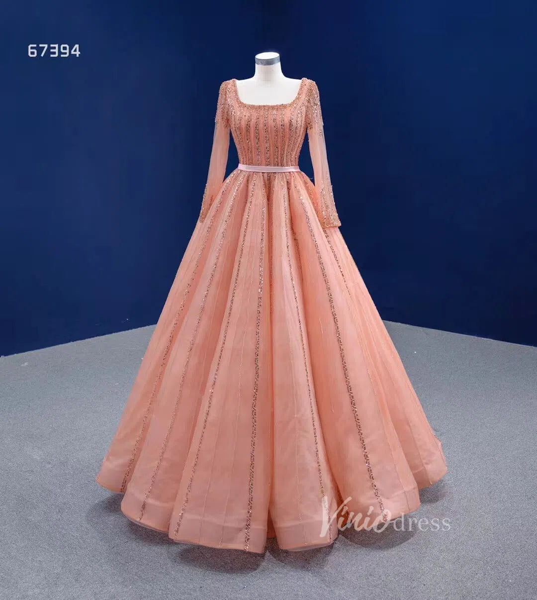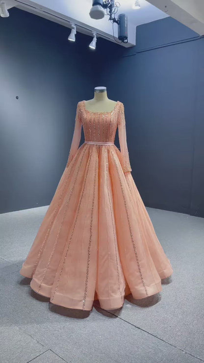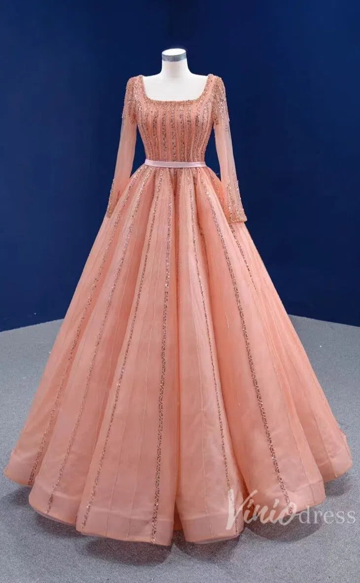 Long Sleeve Beaded Prom Dresses Peach Square Neck 67394 viniodress