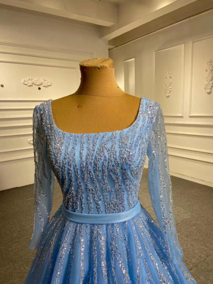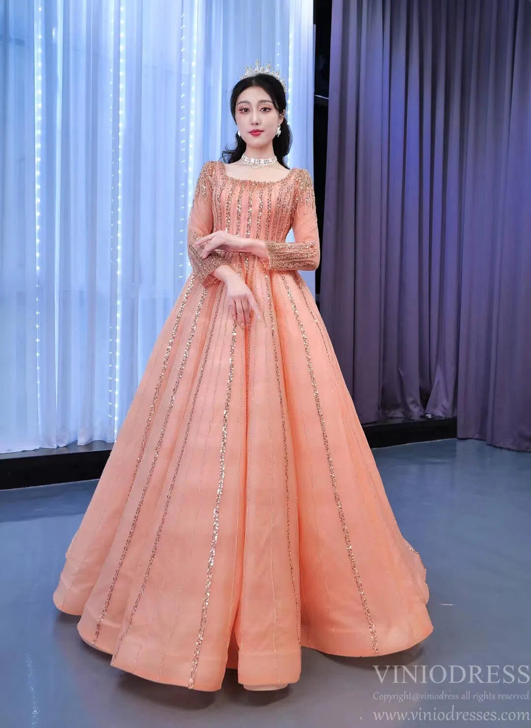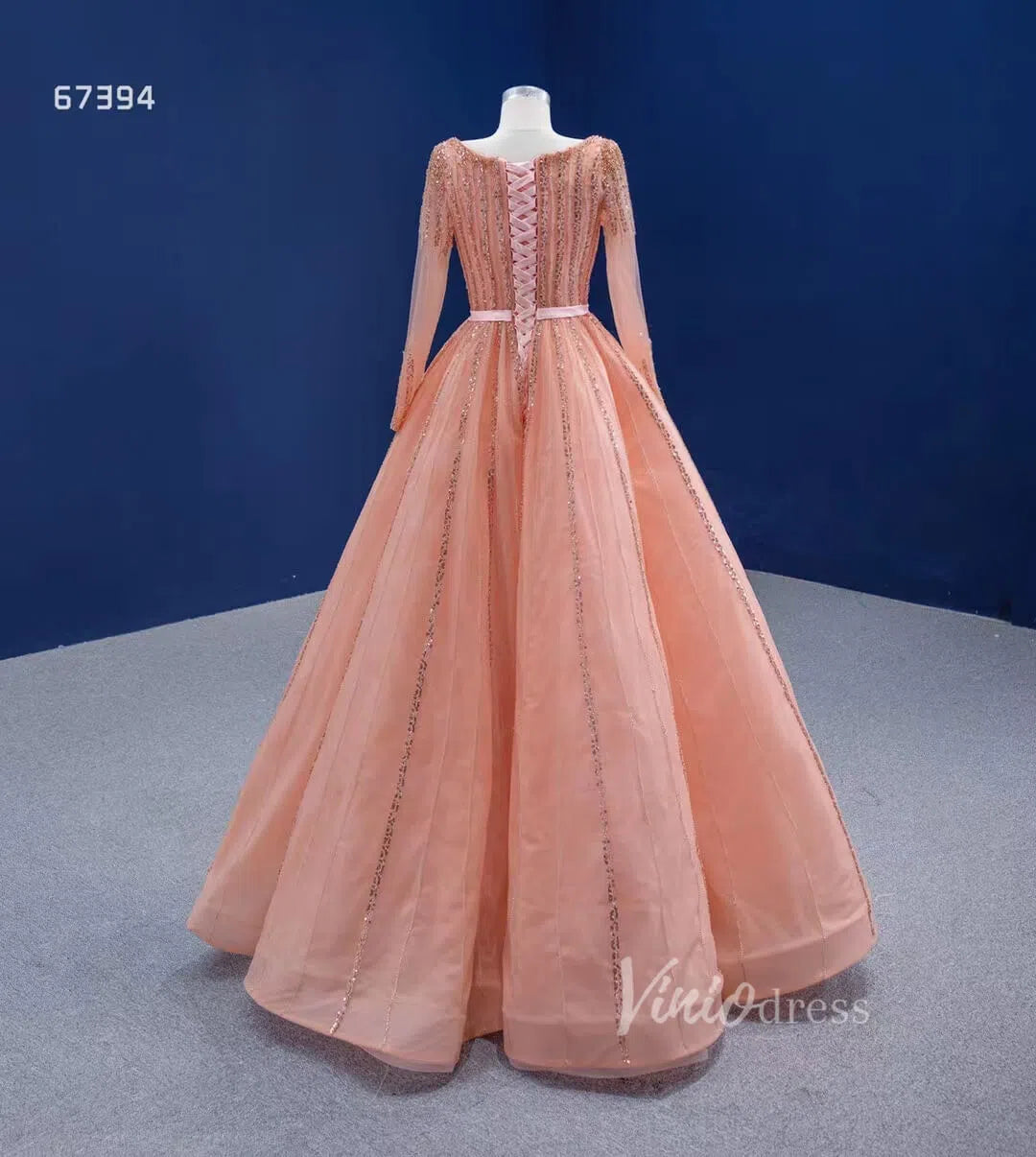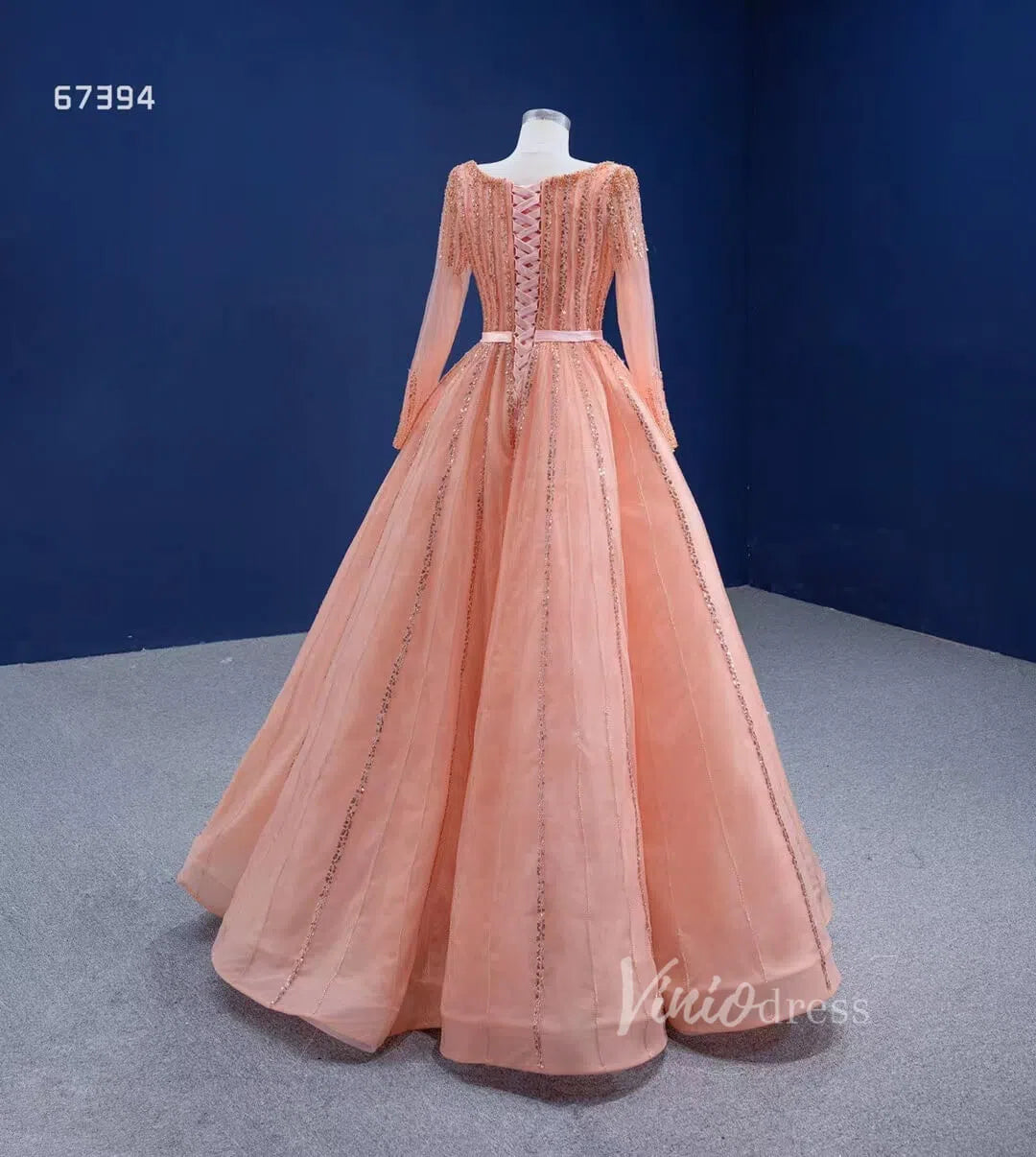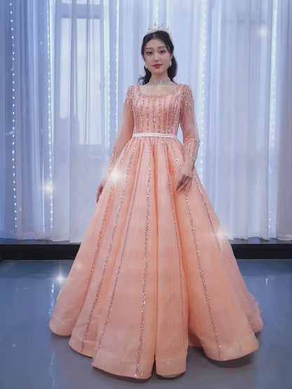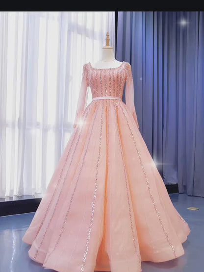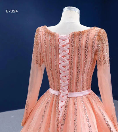 Long Sleeve Beaded Prom Dresses Peach Square Neck 67394 viniodress
