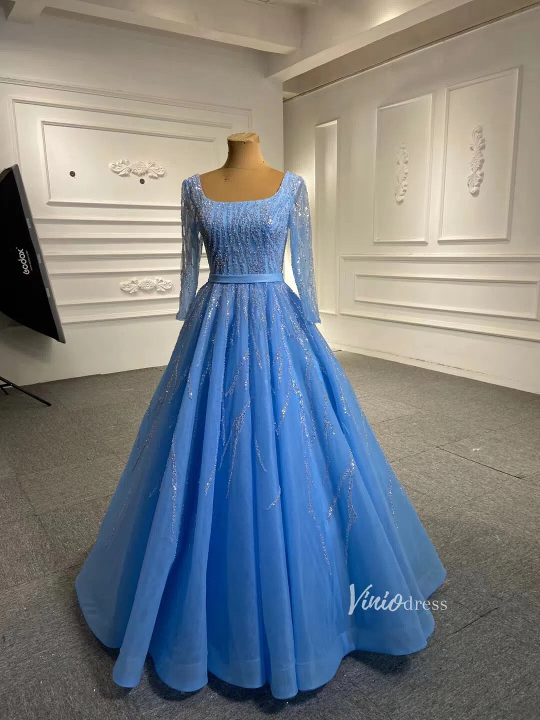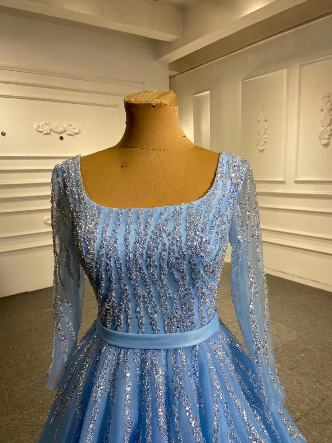 Sparkly beaded tulle prom dress with long sleeves.