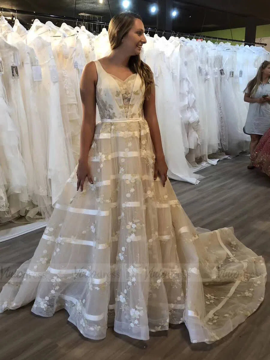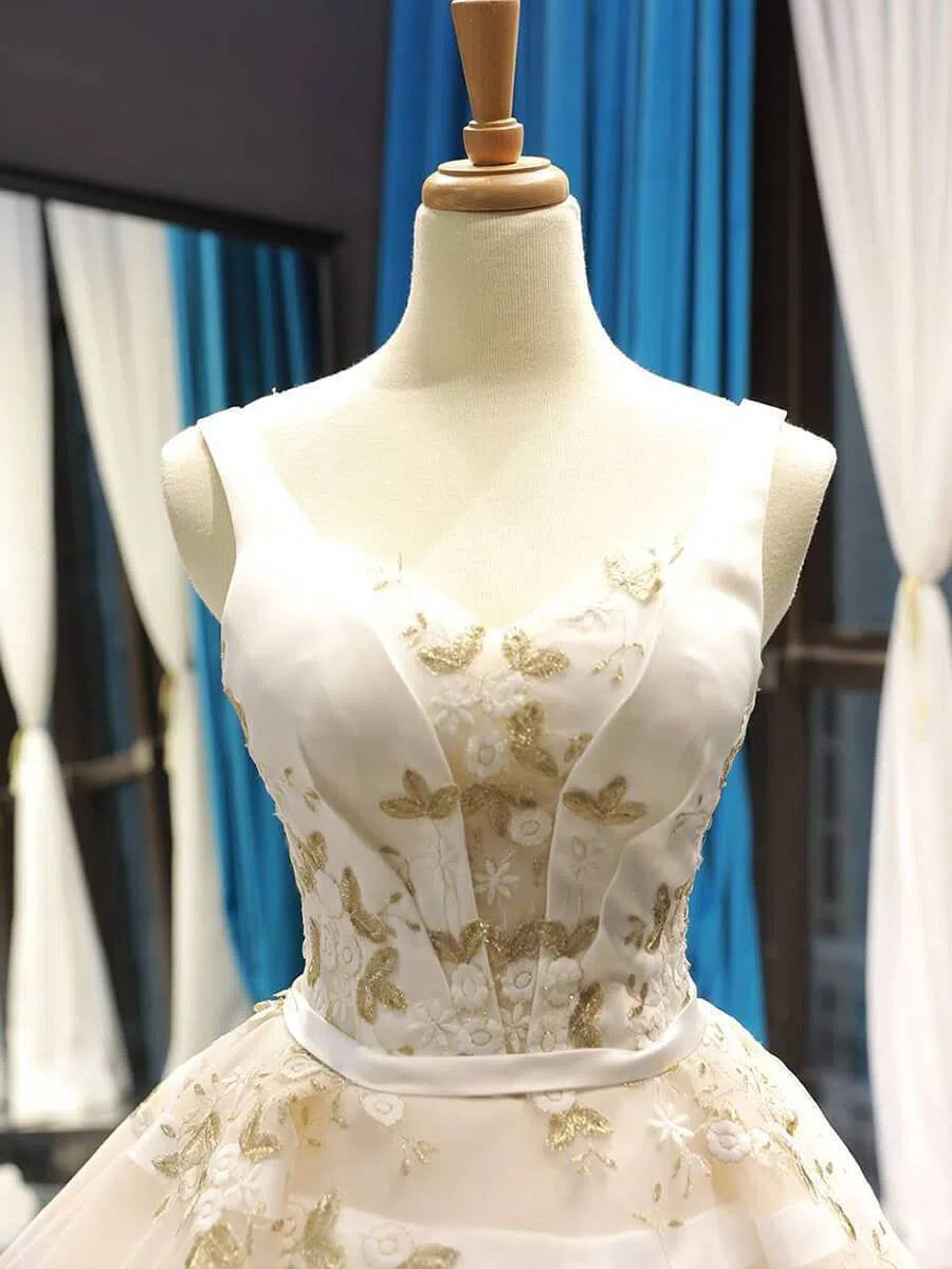 Long champagne floral embroidery prom dresses.