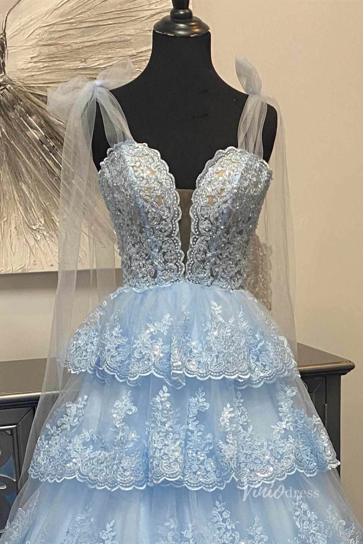 Elevate your elegance in this Ruffle Prom Dress. The tiered ruffle design is delicately detailed with lace appliqued hem, while the sash strap and v-neck add a touch of glamour. With a beautiful sweep train, you'll make a sophisticated statement at any formal event.