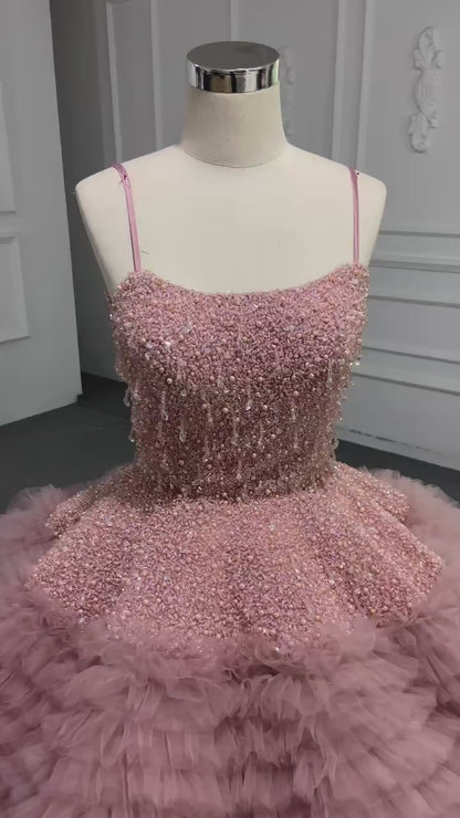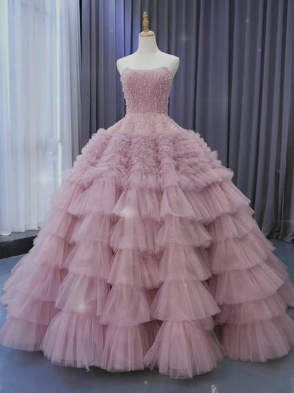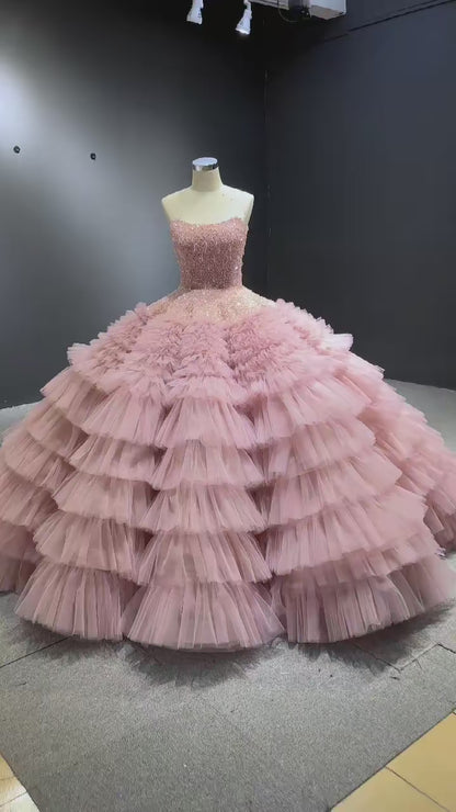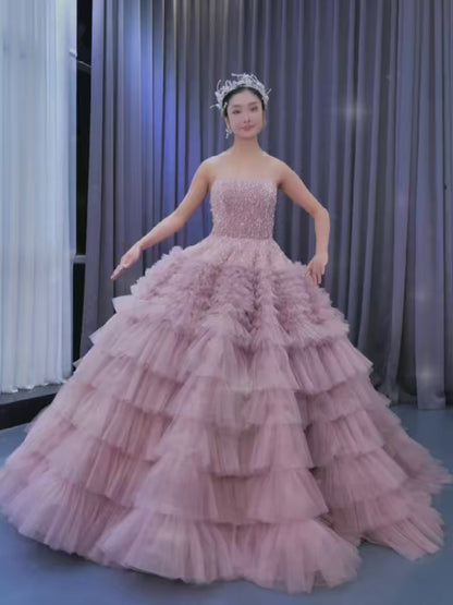 This haute couture ball gown features a beaded bodice and a tiered ruffle tulle bottom, with a strapless silhouette and corset back. It's available in Dusty Rose and can be custom-made in other colors. This princess ball gown is perfect for any special occasion like a Debut ceremony, sweet 16, or wedding.