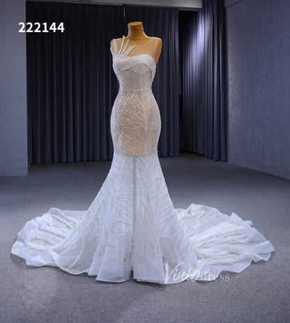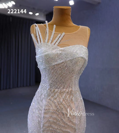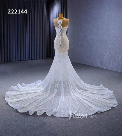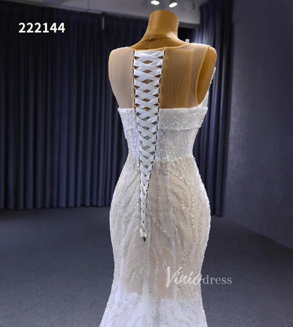 Flaunt your curves in this stunning white mermaid wedding dress! Delicately beaded with sheer design and corset back, this gorgeous bridal gown is designed to add an extra touch of sophistication with its 1 meter long train and see through accents. Get ready to say "I do" in unforgettable style!