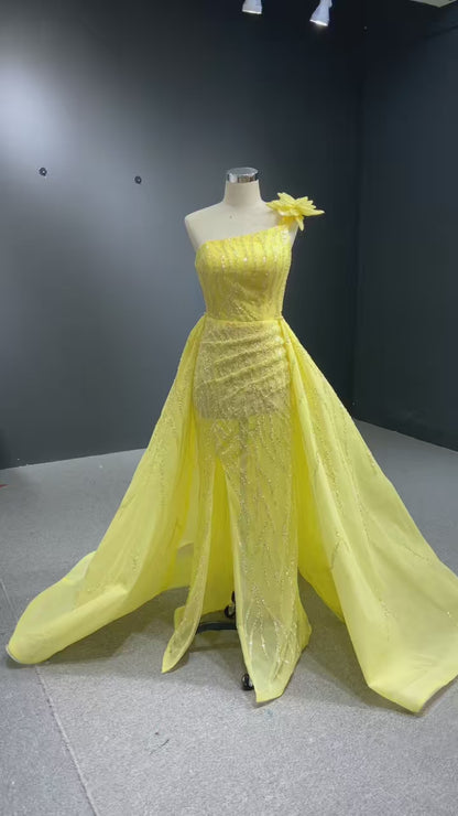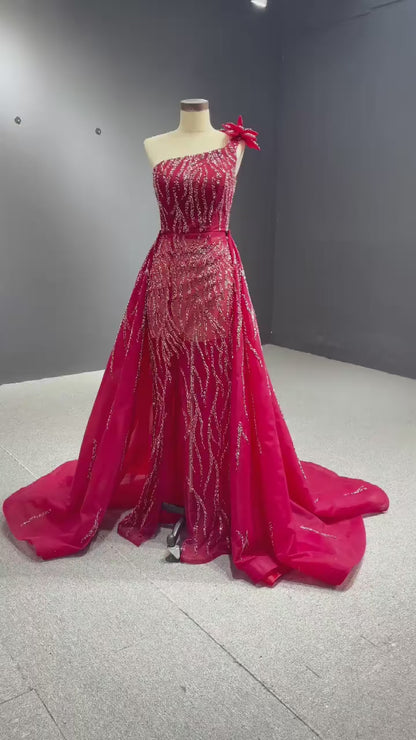 Beaded one shoulder formal evening gown with detachable overskirt.