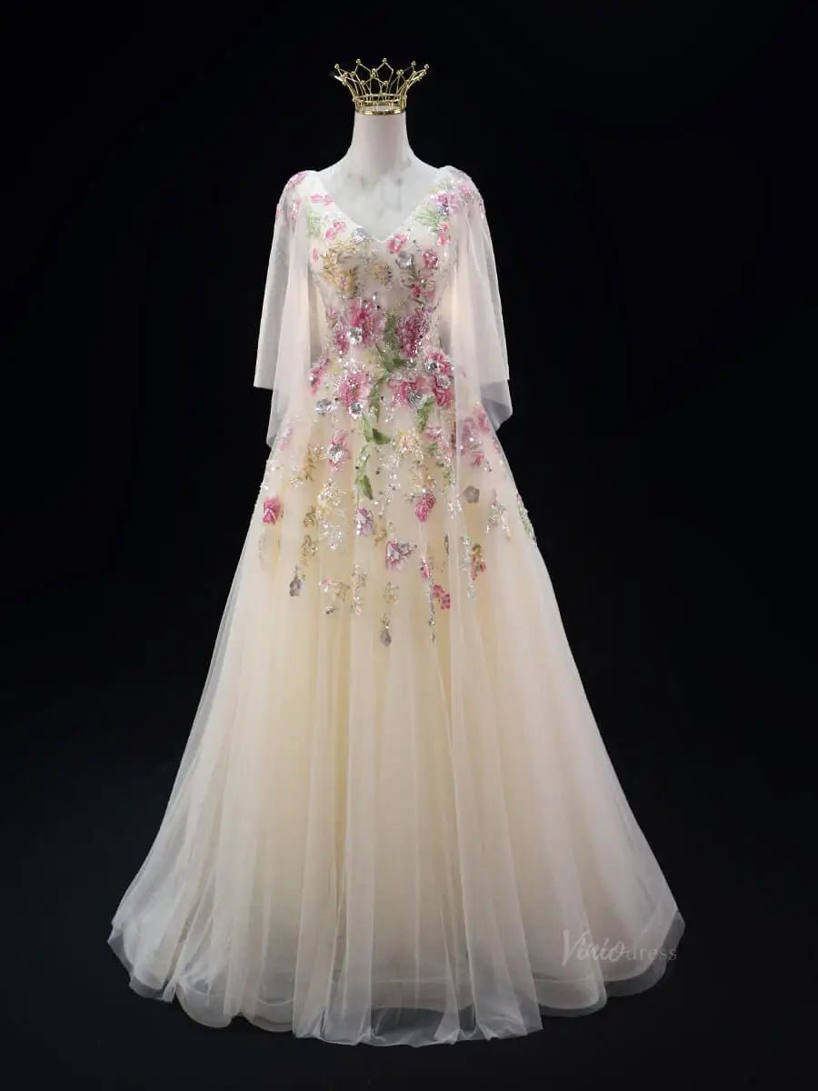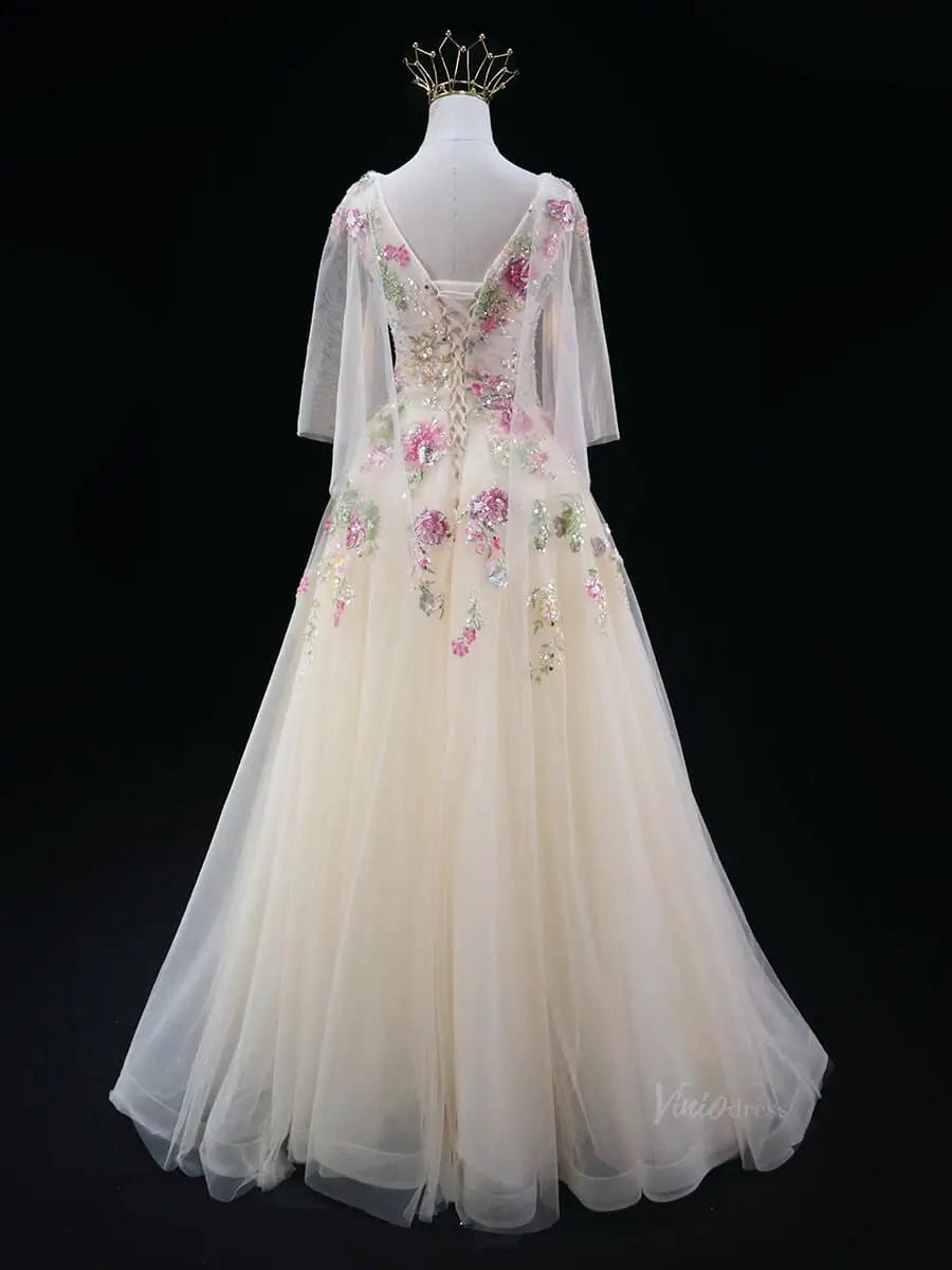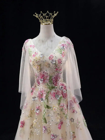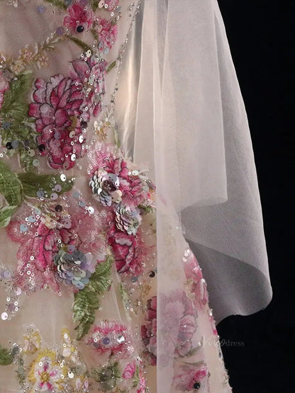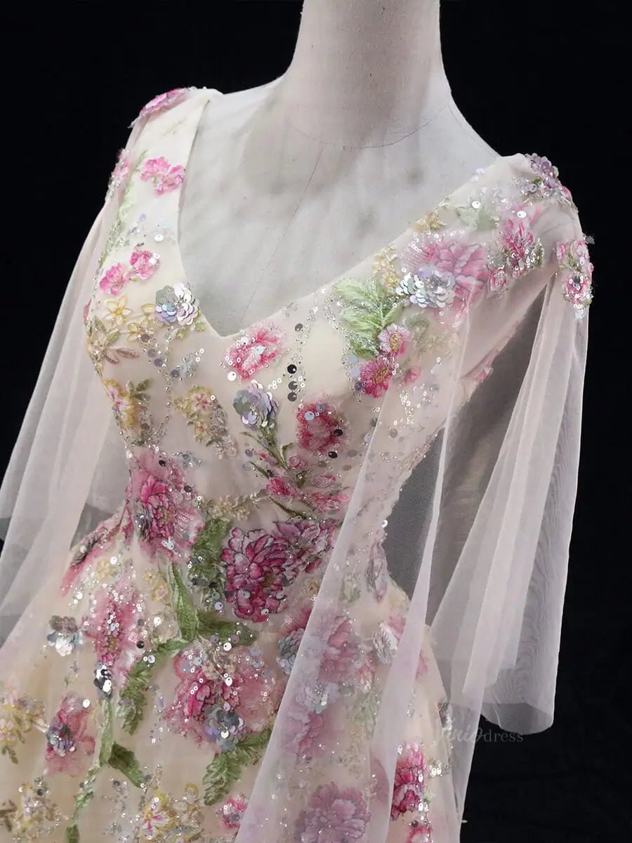 Yellow Floral Tulle Prom Dresses with V-Neck, Sparkly Lace, Boat Neck, Formal Dresses SU043